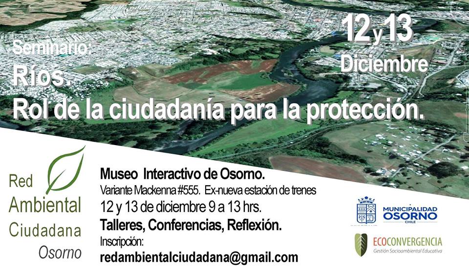Los días martes 12 y miércoles 13 de diciembre, en el Museo Interactivo de Osorno, región de Los Lagos, se realizará el Seminario para reflexionar sobre el rol de la Ciudadanía para la protección de los Ríos. En el expondrán: Juan Pablo Orrego – integrante de Patagonia sin Represas; y José Araya -integrante de Acción por los Cisnes / Valdivia. El seminario contará con talleres y conferencias.