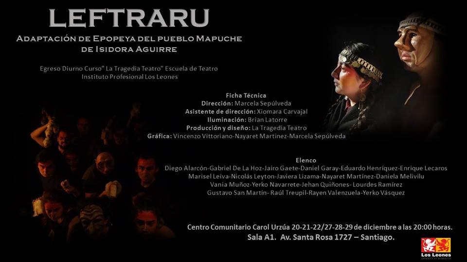 En el Centro Comunitario Urzúa (ubicado en Avenida Santa Rosa 1727 de Santiago) se realizará los días 27, 28 y 29 de diciembre a las 20 horas la obra teatral «Leftraru», adaptación de epopeya del Pueblo Mapuche de Isidora Aguirre.