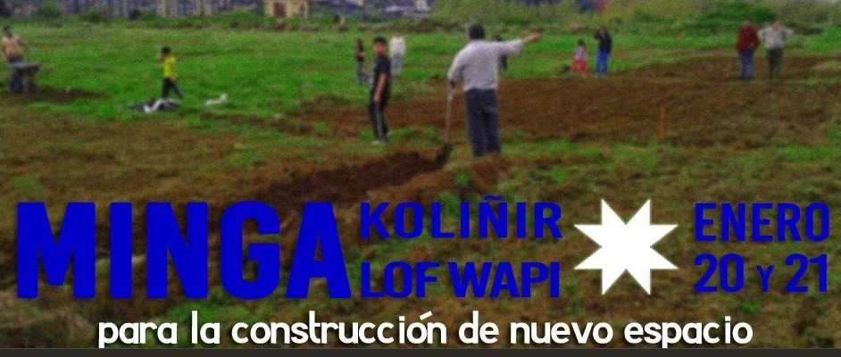El sábado 20 y domingo 21 de enero del 2018 se realizará una minga solidaria para la construcción de un nuevo espacio en el Lof Koliñir, sector de Isla Teja. Esta actividad es autogestionada entre la comunidad Koliñir y la Red de Defensa de los Territorios – Los Ríos.
