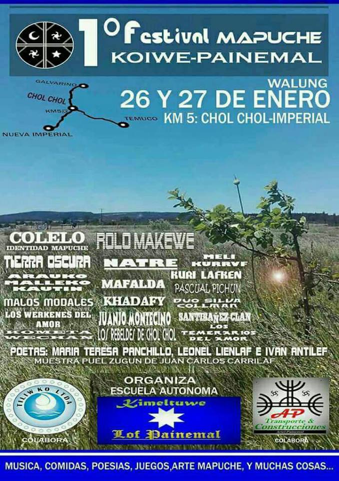 Este viernes 16 y sábado 27 de enero se realizará un  festival mapuche en el sector Koiwe Painemal de Chol Chol con la participación de destacados artistas. Ver video promocional y luego afiche.