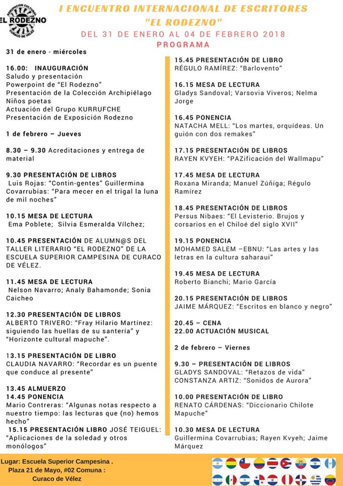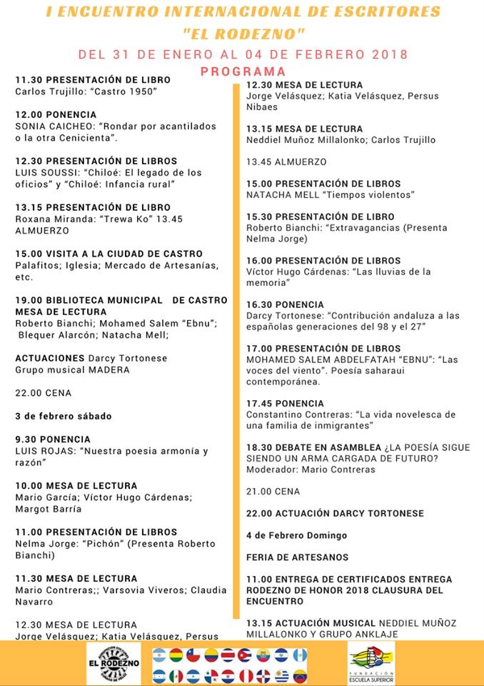 El encuentro internacional de escritores “El Rodezno” se realizará del 31 de enero al 4 de febrero de este 2018 en la  en Curaco de Vélez,  Escuela Superior Campesina, en el Centro Cultural, en la Feria de Artesanos y en la Biblioteca Municipal de Castro.