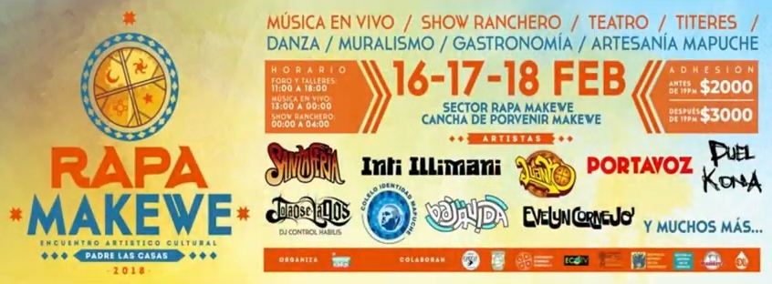 Por quinto año la Agrupación cultural Makewe Kimün invita a todas las personas, territorios y comunidades a participar del Rapa Makewe a realizarse el 16, 17 y 18 de febrero. Rapa Makewe es un festival que muestra lo mejor de la cultura Mapuche, de manera autogestionada y autónoma, la jornada contará con más de treinta artistas en escena, malabares, títeres, juegos para niñxs, muralismo, etc, además de cincuenta locales de gastronomía mapuche exclusiva del territorio de makewe y orfebrería de distintas partes del Wallmapu.
