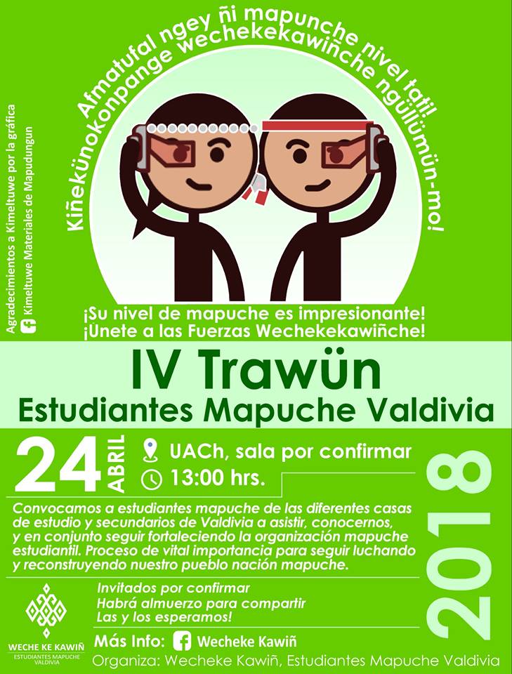 A todas y todos los estudiantes mapuche de Valdivia, de institutos, de las diferentes universidades, así como estudiantes mapuche secundarios, hacemos extensiva esta invitación al IV Trawün de Estudiantes Mapuche en Valdivia.