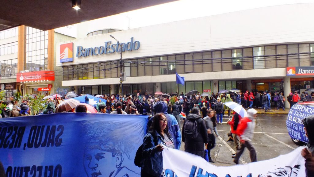 En medio de una fuerte lluvia, este lunes se realizó una masiva movilización por las calles de Temuco en apoyo a las demandas del Machi Celestino Córdova y en protesta ante la negativa del gobierno para que pueda acceder a su Rewe.