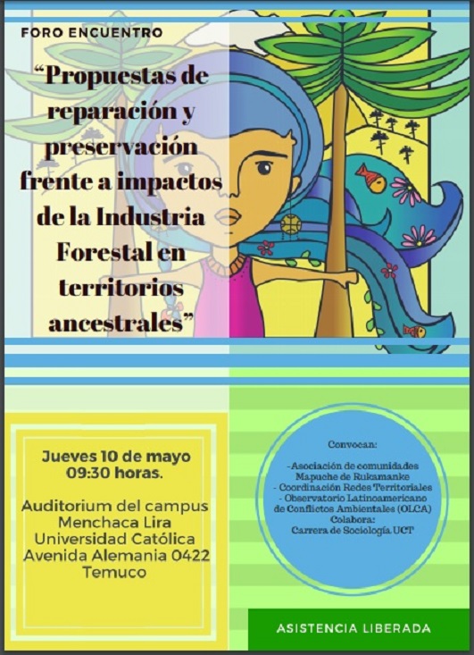 9/05/2018.- La Asociación de comunidades Mapuche por el Rukamanke se encuentra organizando su 1er txawün y ngütxam público y que se denomina “Propuestas de restauración y preservación frente a impactos de la Industria Forestal en territorios ancestrales”, el que se realizará el el jueves 10 de mayo y que comenzará a las 09,30 horas en el Auditorium del campus Menchaca Lira de la Universidad Católica ubicado en calle Avenida Alemania 0422 en la ciudad de Temuco.