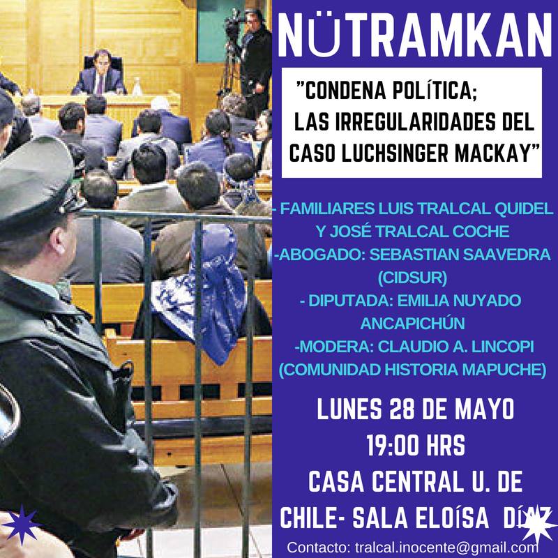 25/02/2018.- El día lunes 28 de mayo a las 19:00 horas, en la sala Eloísa Díaz, de la Casa Central de la Universidad de Chile (Av. O’higgins 3363, Santiago), se realizará el «Nutramkan: Condena política; las irregularidades del caso Luchsinger Mackay».