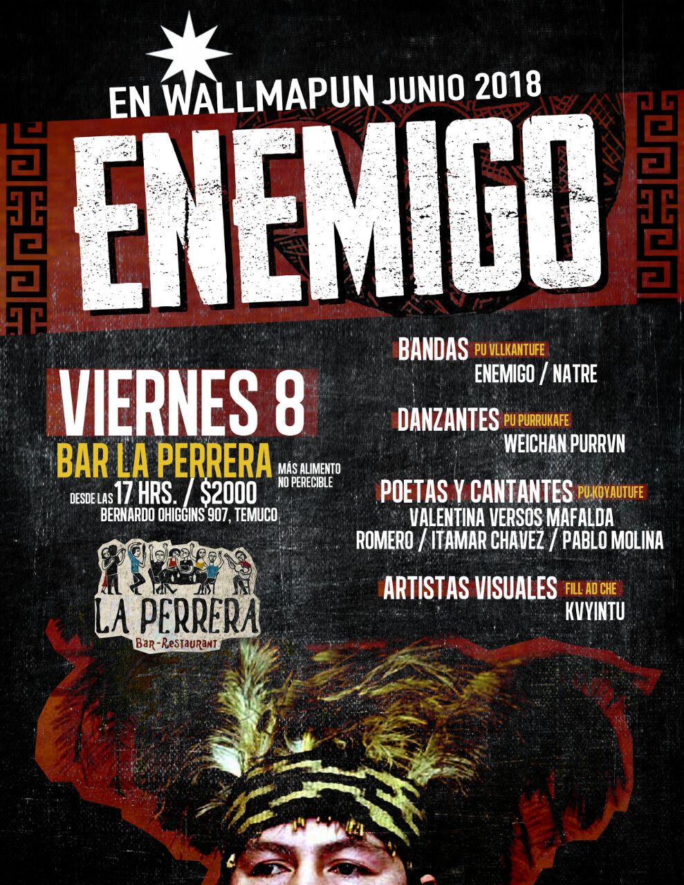 En bar La Perrera (O”Higgins # 907, desde las 17 horas), viernes 8 Junio: ENEMIGO + NATRE + CHICHA CON HARINA + WEICHAN PURRVN + JESSICA NAUTO / KOYAUTUFE + MAFILU / KOYAUTUFE. Exposición fotografías de Felipe Duran. Pinturas Carla Dplors ka Flekcha