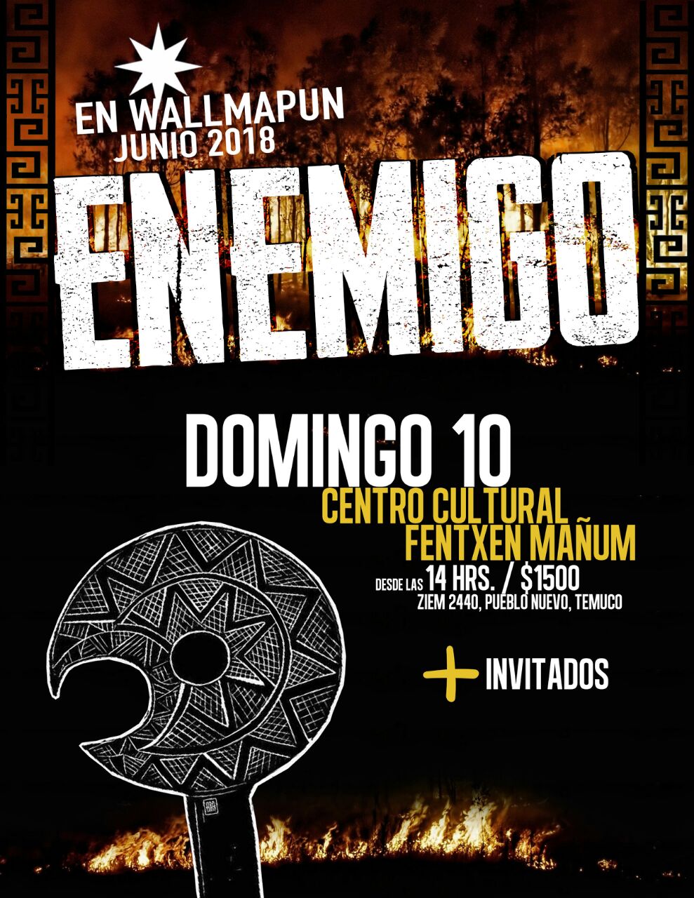 Desde la mixtura, la fusión y lo ancestral, desde el amor por la tierra y el respeto a las fuerzas de la naturaleza; desde el repudio a injusticias y abusos hacia el Pueblo Mapuche y autoridades tradicionales. Contra toda forma de opresión, se presenta en Temuco KAYÑE ! ENEMIGO !, en los siguientes espacios y con los/as siguientes participantes: