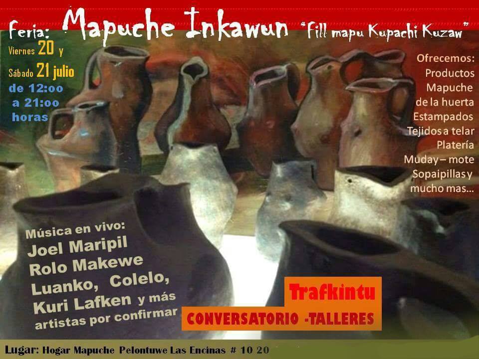 Marri marri kom pu lamgen, extendemos la invitación a la Segunda Feria Mapuche Inkawun, a realizarse los viernes 20 y sábado 21 de julio en el Hogar Mapuche Pelontuwe, Las Encinas 1020, Temuko. Desde las 12:00 a 21:00.
