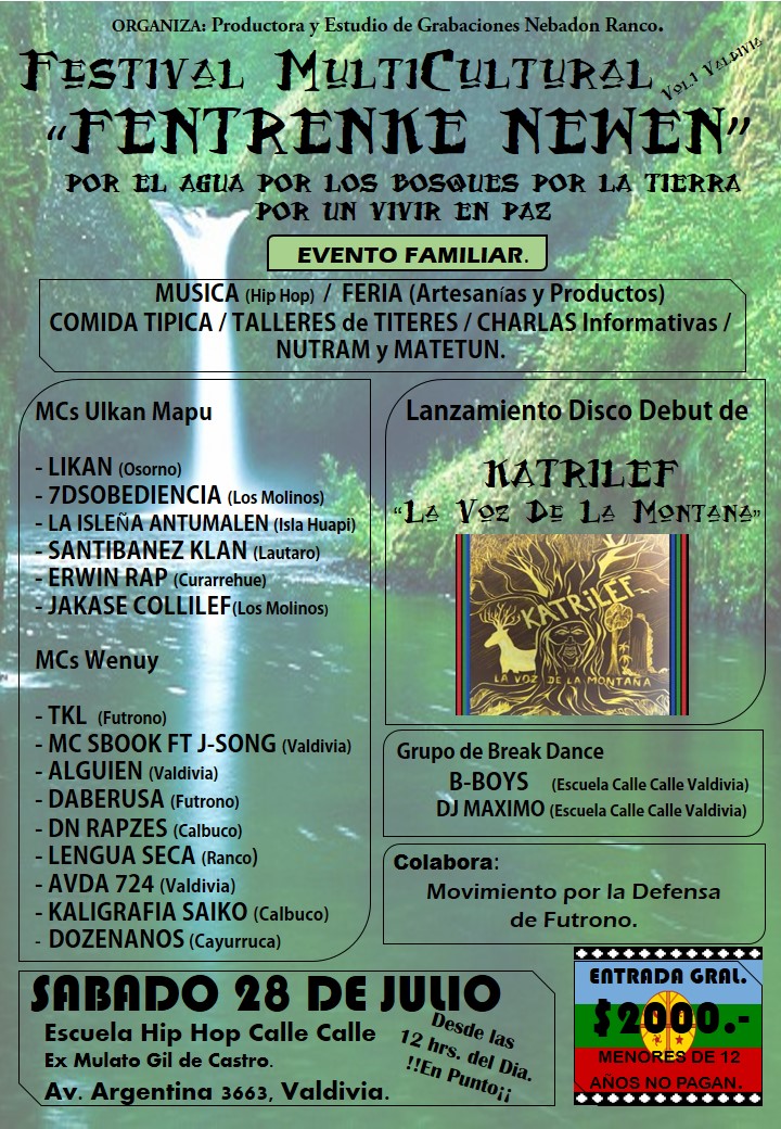 El Fentrenke Newen -conjunción de energías- es organizado por la Productora Nebadon, el Estudio de Grabación Ranco y MC Katrilef, con el respaldo y colaboración del Movimiento por la Defensa de Futrono. El evento comenzará a las 12 horas el 28 de julio en la ex escuela Mulato Gil de Castro, en Av. Argentina n° 3663.