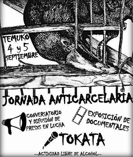 31/08/2018.- En el Hogar Mapuche Pelontuwe, (ubicado en Las Encinas 01020) se realizará el día martes 4 septiembre desde las 10:00 am hasta las 20 hrs y el día miércoles 5 de septiembre desde las 16 horas,en los pastos de la Universidad de La Frontera, (Av. Salazar 1145) , la Jornada Anticarcelaria, que contará con exposición de documentales, conversatorios, foros, bandas invitadas, ferias y exposición fotográfica.