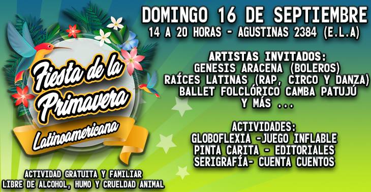 10/09/2018.- El día domingo 16 de septiembre, desde las 14 a 20 horas, en Agustinas 2384, Santiago, se realizará la Fiesta de la Primavera Latinoamericana, actividad familiar y gratuita que contará con música, juegos infantiles, editoriales independientes, entre muchos otros. Al respecto la organización comenta: «Como organizaciones, queremos levantar y recuperar parte de lo nuestro, eso que se nos ha negado y se ha cambiado por el nacionalismo de las fiestas patrias. Por esto, tenemos la necesidad de levantar una fiesta popular, la »Fiesta de la primavera latinoamericana», para que disfrutemos y pasemos un buen rato entre hermanos y hermanas latinoamericanos».