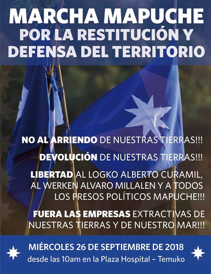 5. Por lo anterior, anunciamos y convocamos a una masiva MARCHA MAPUCHE POR LA RESTITUCIÓN Y DEFENSA TERRITORIAL en la ciudad de Temuco, para el día miércoles 26 de septiembre desde las 10 de la mañana en la Plaza Hospital. Nuestro llamado se extiende a todas las comunidades, organizaciones, personas mapuche y chilenos solidarios a sumarse a esta movilización por la defensa de nuestra MAPU, y repudiar la política empresarial que impulsa este gobierno que busca frenar el avance de nuestros derechos territoriales.