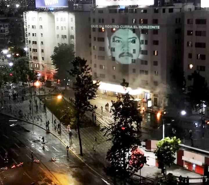 Todo arde. Llegamos ante el corte más grande de la Alameda, entre Santa Rosa y Portugal, hay gente resistiendo, cantando, con afafanes, con gritos. Nos quedamos un rato mirando desde la altura del Huelen, luego nos unimos al griterío callejero. A esa hora, paralelamente, hay una imagen con el rostro de Camilo Catrillanca que se proyecta en los edificios de Plaza Italia.