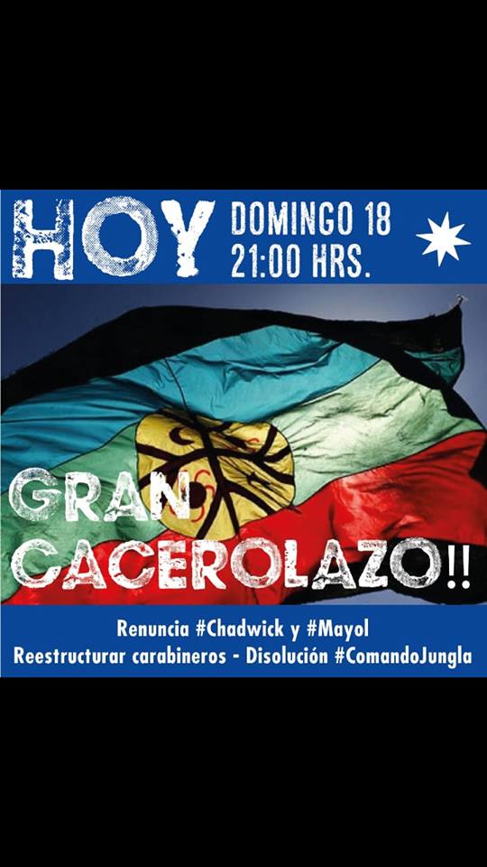 Hoy domingo 18 de noviembre a las 21 horas todo Chile y Wallmapu se pronuncia y dice BASTA! Gran Cacerolazo!! Caceroleo y protesta nacional ahora por la renuncia de #chadwick, la reestructuración de carabineros y la disolución del #comandojungla.