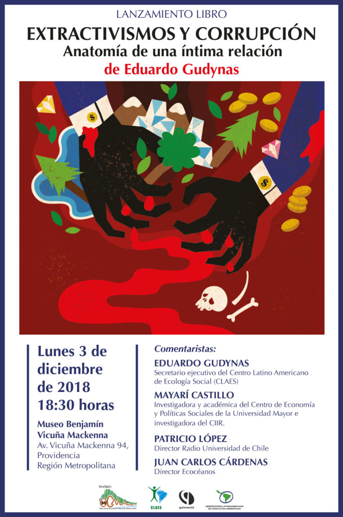 Santiago, 30 de noviembre de 2018. (olca.cl)– Organizaciones ambientales chilenas y latinoamericanas y académicos locales lanzarán este lunes 3 de diciembre el libro “Extractivismos y Corrupción: Anatomía de una íntima relación”, del destacado investigador, Eduardo Gudynas, quien es una de las voces mundiales al momento de analizar los conflictos socio ambientales y los impactos de los llamados extractivismos en las democracias, la economía y los mercados de América Latina.