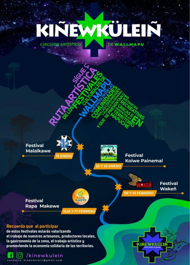 Kiñewküleiñ: Circuito Artístico de Wallmapu, es una plataforma en la que convergen distintos encuentros culturales mapuche: Encuentro Rapa Makewe, Encuentro Cultural Malalkawe, Festival Koiwe Painemal y Festival Wakeñ, y que hoy quieren hacer pública, con festivales que van desde el 19 de enero hasta mediados de febrero en diversos puntos de comunidades mapuche de la denominada Región de La Araucanía.