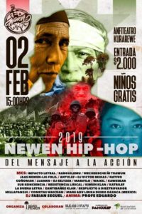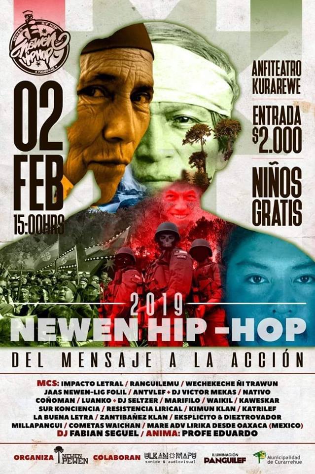 Este sábado 02 de febrero, desde las 16:oo hrs en el tradicional Anfiteatro de Curarrehue, tendrá lugar la novena versión del Encuentro Musical y artístico mapuche Newen Hiphop 2019, con la presencia de destacados exponentes nacionales e internacionales.