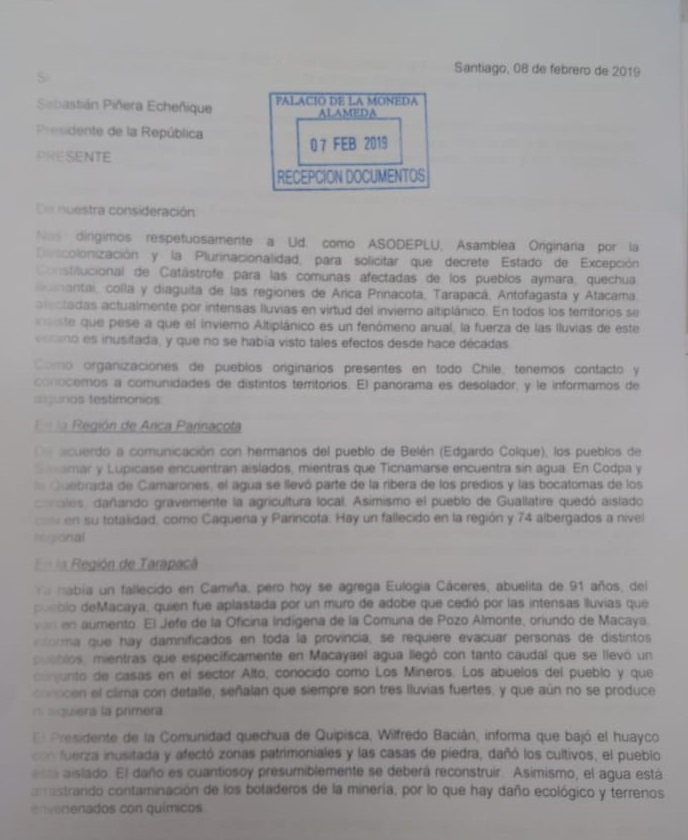 08/02/2018.- A continuación, extendemos la Carta enviada por la Asamblea Originaria por la Descolonización y la Plurinacionalidad ASODEPLU, a Sebastián Piñera ante las terrible situación que afecta a los pueblos Aymara, Quechua, Likan antai, Colla y Diaguita en las regiones de Arica Parinacota, Tarapacá, Antofagasta y Atacama, quienes se ven afectados actualmente por las intensas lluvias a causa del invierno altiplánico en el norte de Chile. La solicitud, viene a solicitar apoyo Estatal mediante el decreto de Estado de Excepción de Catástrofe en los territorios afectados, donde existen personas damnificadas y aisladas, y de mismo modo manifiesta el cuestionamiento existente ante el decreto de Estado de Excepción Constitucional de catástrofe en tres regiones de Wallmapu (comunas de Bío Bío, Araucanía, Los Ríos) mediante el uso de Fuerzas Armadas por los incendios forestales.