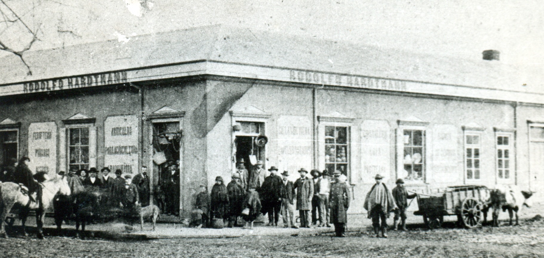 En Prat esquina de Bello, en Temuco, un grupo de vecinos posa para el fotógrafo en 1886