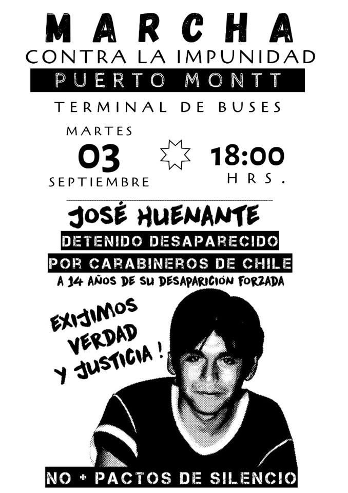 02/09/2019.-El día martes 3 de septiembre desde las 18:00 horas, en el Terminal de Buses Puerto Montt (Diego Protales 1001) , invitan a marcha contra la impunidad, por la verdad y justicia para el joven José Huenante, detenido desaparecido por Carabineros de Chile en democracia.