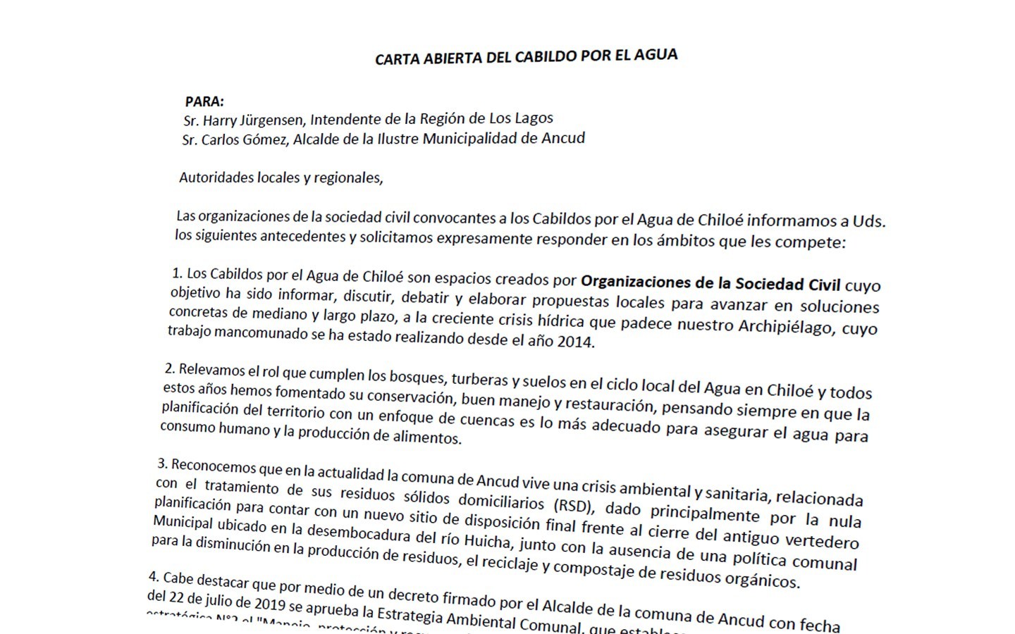 Las organizaciones de la sociedad civil convocantes a los Cabildos por el Agua de Chiloé informamos a Uds. los siguientes antecedentes y solicitamos expresamente responder en los ámbitos que les compete: