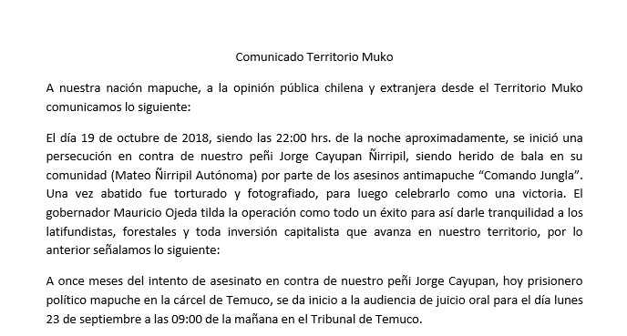 El día 19 de octubre de 2018, siendo las 22:00 hrs. de la noche aproximadamente, se inició una persecución en contra de nuestro peñi Jorge Cayupan Ñirripil, siendo herido de bala en su comunidad (Mateo Ñirripil Autónoma) por parte de los asesinos antimapuche “Comando Jungla”. Una vez abatido fue torturado y fotografiado, para luego celebrarlo como una victoria. El gobernador Mauricio Ojeda tilda la operación como todo un éxito para así darle tranquilidad a los latifundistas, forestales y toda inversión capitalista que avanza en nuestro territorio, por lo anterior señalamos lo siguiente: