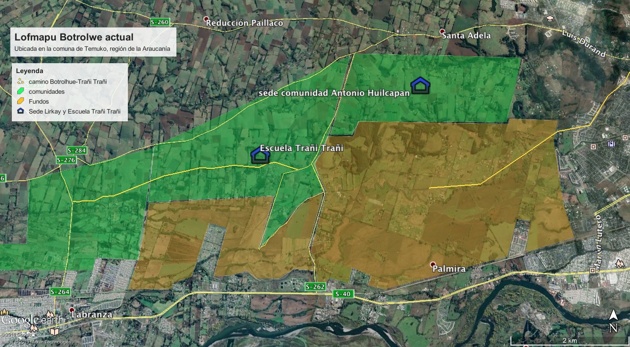 Para ubicarnos geográficamente, este territorio está –hoy- asentado entre la avenida Luis Durand y el sector norte de Labranza (Complejo Deportivo) en la comuna de Temuko. En la actualidad, en el lof mapu Botrolwe -incluido Trañi Trañi- están las comunidades Antonio Coline, Juan Painenao, Juan Huaiquinao, Guenchulle Linconao, Juan Collinao, Juan Cayupan, Antonio Mariman, Juan Antinao y Domingo Marinao, las que componen un importante cordón humano unido ancestralmente a través de relaciones de parentesco. Antes de ser anexadas -al Estado chileno- estas comunidades y otras vecinas como Kowilwe/Lirkai hacían plena ocupación de los valles y vegas que se forman en este espacio y que eran conectadas por el camino denominado “Botrolhue S-280”, el cual hoy se encuentra cerrado por distintos loteos asentados en el lugar. Estos condominios, barrios y villas se constituyeron tras erradicarse al menos 5 comunidades del territorio y desafectarse tierra mapuche previo a la entrada en vigencia de la Ley Indígena 19.253, algunas de esas comunidades son Agustín Mariman, María Huenchuman, Miguel Huenulaf, Juan Bautista Nahuelpan y Juan Cariqueo.