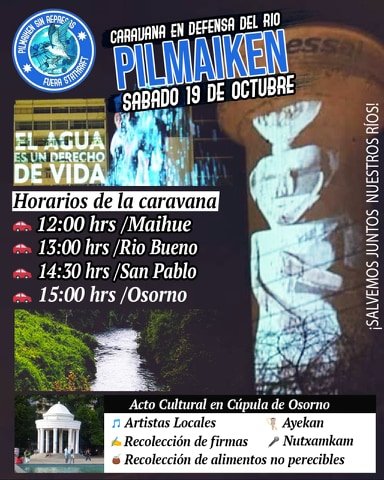 17/10/1019.- El día Sábado 19 de Octubre , (a las 12 horas en Maihue; 13 hrs en Río Bueno;14:30 hrs en San Pablo y 15 hrs en Osorno) se invita a toda la Comunidad Mapuche y no Mapuche de distintos territorios, a organizaciones sociales y medioambientales, a un evento Familiar por la defensa del Río Pilmaiquén, para visibilizar el más amplio rechazo contra las Centrales Hidroeléctricas (proyecto Central Hidroeléctrica los Lagos, Central Hidroeléctrica Osorno y Central Rucatayo propiedad de la empresa estatal noruega Statkraft) que se pretenden instalar en territorio huilliche.