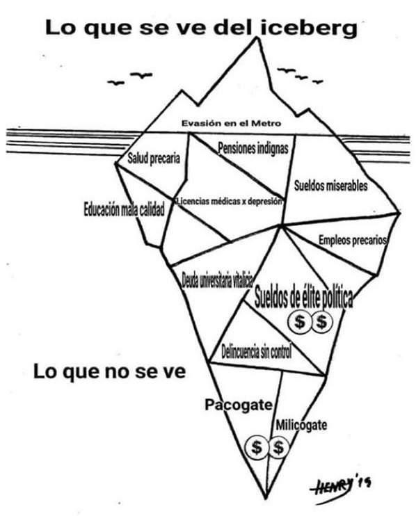 Por las redes sociales circula una imagen que intenta explicar el problema. Como punta del iceberg –se muestra–, aparecen las protestas por el alza de la tarifa del metro, que comenzaron la semana pasada con entradas masivas de jóvenes saltando los accesos del metro sin pagar. Pero de acuerdo al dibujo, existe una parte profunda del iceberg que no se ve: “Pensiones indignas, salud precaria, sueldos miserables, educación de mala calidad, licencias médicas por depresión, deuda universitaria vitalicia, sueldos de la élite política, delincuencia sin control, empleos precarios, Pagogate y Milicogate [los escándalos de corrupción en Carabineros y el Ejército, respectivamente]”. En definitiva, que lo que ocurre tendría relación a un hartazgo que ni este Gobierno ni los anteriores han logrado apaciguar.