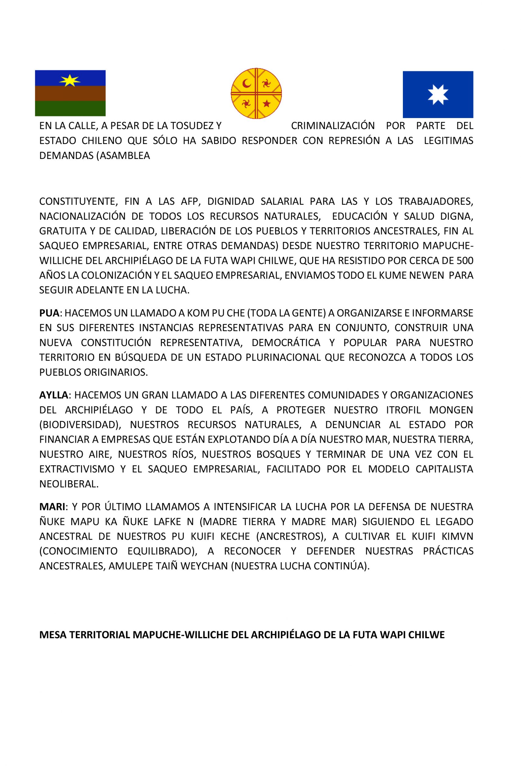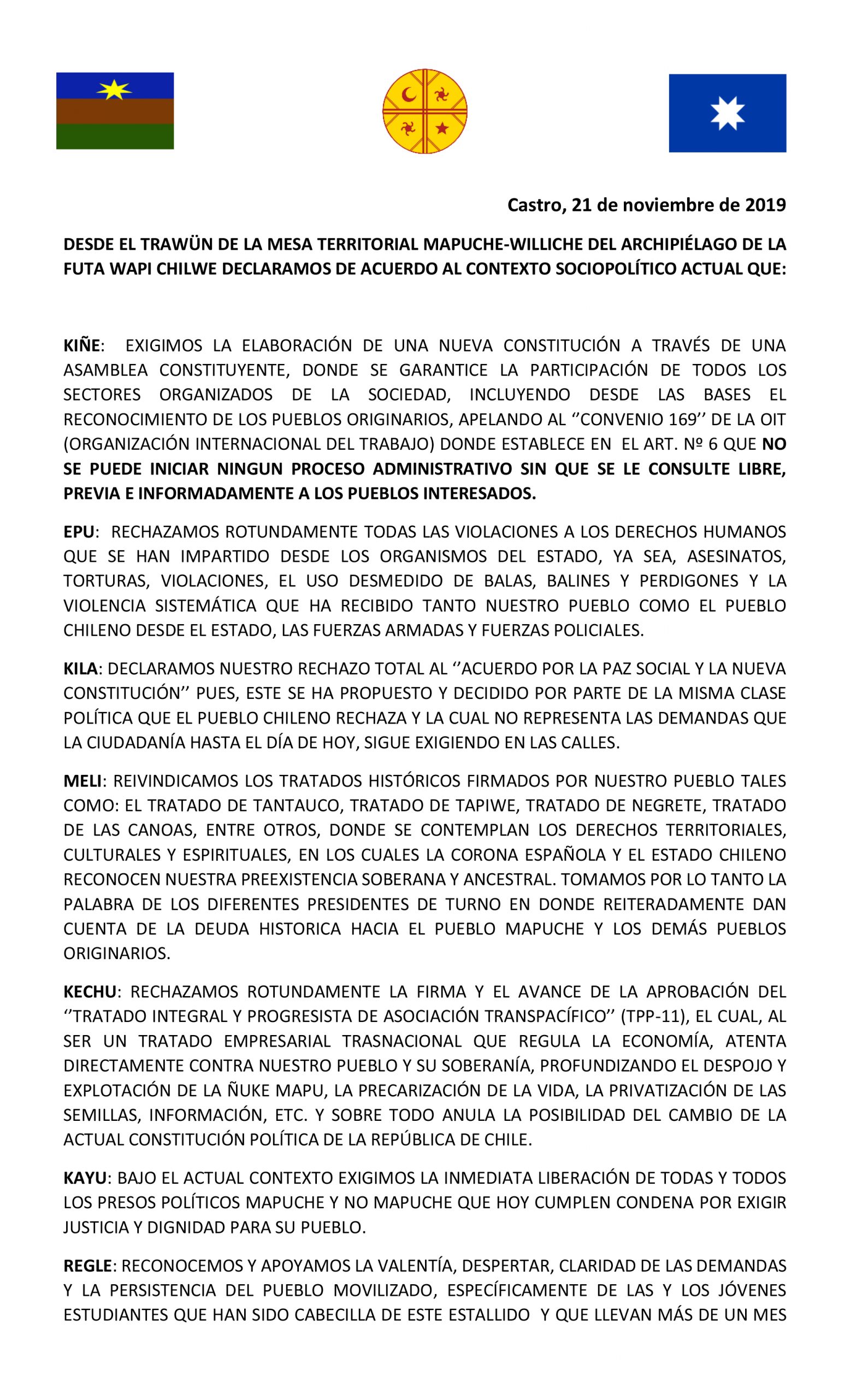 La Mesa Territorial Williche además apoyo la lucha de los estudiantes de la zona y exigió que su permanente demanda de hacer valer el Tratado de Tantauco firmado en 1825 entre la naciente República de Chile y las comunidades indígenas de Chiloé.