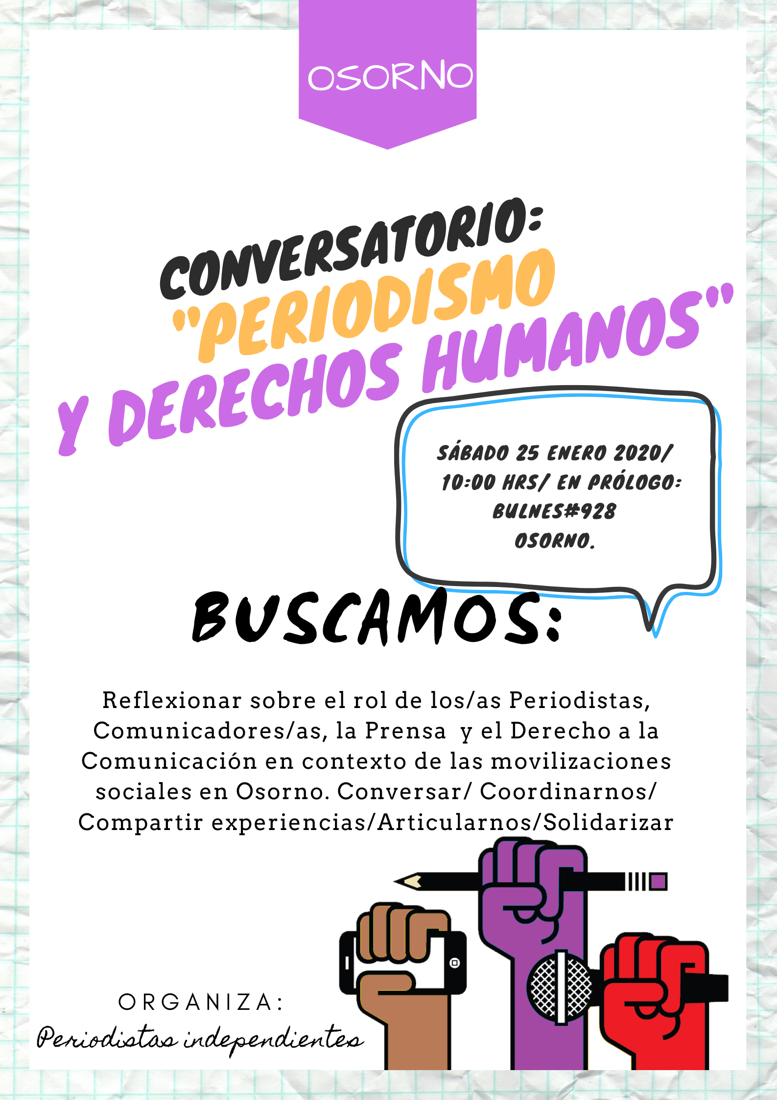 Es por esto que se invita a periodistas y /o comunicadores/as a reflexionar sobre nuestro rol, sobre el Derecho a la Comunicación en relación a los Derechos Humanos, en un conversatorio abierto que busca realizar un diagnóstico sobre la situación de la prensa, libertad de expresión y censura en relación a las movilizaciones en Osorno; generar un espacio de reflexión, discusión e intercambio crítico de experiencias entre Periodistas, Comunicadoras/es a nivel local y promover la generación de una red de articulación y apoyo entre Periodistas y Comunicadores/as movilizados/as.