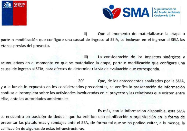 Lo anterior porque ha constatado que hay un gran número de sondajes que, atendiendo a la ley vigente, deberían haberse ingresado a evaluación de impacto ambiental, así el mismo ente expone:  “Se visualiza que en el sector de las denuncias, existe un alto número de plataformas y sondajes, que en su conjunto superarían el umbral de 40 plataformas y sus respectivos sondajes (…) Que, no obstante, las plataformas y sondajes han sido ingresadas al SEIA o ha sido consultada su pertinencia de ingreso a dicho sistema, de forma dividida”. Y se hace evidente que “las consultas de pertinencia de ingreso al SEIA no corresponden a un tipo de evaluación” y por tanto una serie de sondajes “no cuentan aún con la pertinente calificación de su impacto ambiental.