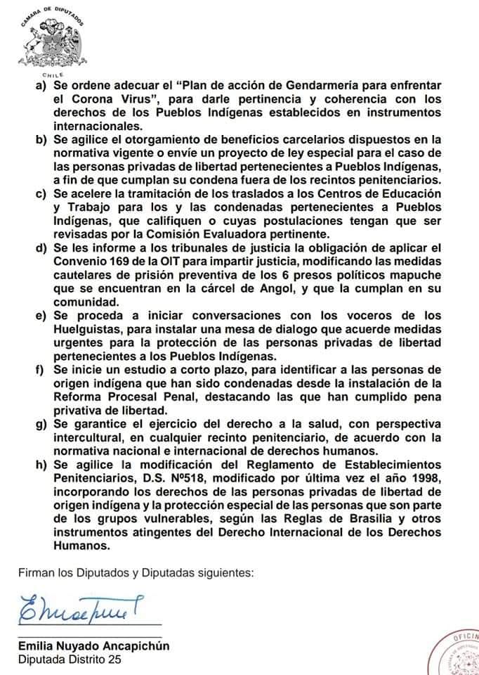 Además, el proyecto de resolución solicita al Ejecutivo «acelerar la tramitación de los traslados a los Centros de Educación y Trabajo para los y las condenadas pertenecientes a pueblos indígenas, que califiquen o cuyas postulaciones tengan que ser revisadas por la Comisión Evaluadora pertinente. También se pide informar la obligación que tienen los tribunales de justicia de aplicar el Convenio 169 de la OIT para impartir justicia, modificando las medidas cautelares de prisión preventiva de los 6 presos políticos mapuche que se encuentran en la cárcel de Angol, y que la cumplan en su comunidad».