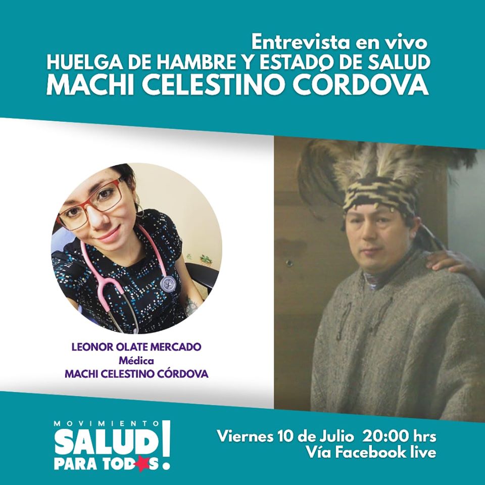 «Como médica del Machi Celestino Córdova, en su día 67 de huelga de Hambre, es necesario comunicar lo grave de su estado de salud física, deteriorio a nivel cardiovascular, renal y neurológico severos. Es necesaria una pronta respuesta del Gobierno a sus demandas.», afirmó Leonor Olate, quien atiende al Machi Celestino Córdova.