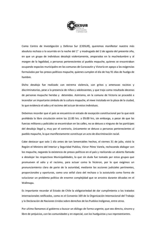 En estado de excepción constitucional, por lo que está prohibida la libre circulación entre las 22 horas y las 5 AM, y donde las fuerzas militares y policiales están a cargo de vigilar las calles, «únicamente se detuvo a personas pertenecientes al pueblo mapuche, lo que manifiestamente constituye un acto de discriminación racial.»