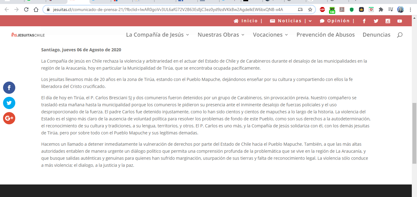 Santiago, 06 de agosto de 2020. (mapuexpress.org)– La Compañía de Jesús en Chile, una de las agrupaciones históricas de la Iglesia Católica, de la cual también es parte el Papa Francisco (Jorge Bergoglio), afirmó que «rechazan la violencia y arbitrariedad en el actuar del Estado de Chile y de Carabineros durante el desalojo de las municipalidades en la región de la Araucanía, y en particular la Municipalidad de Tirúa, que se encontraba ocupada pacíficamente».