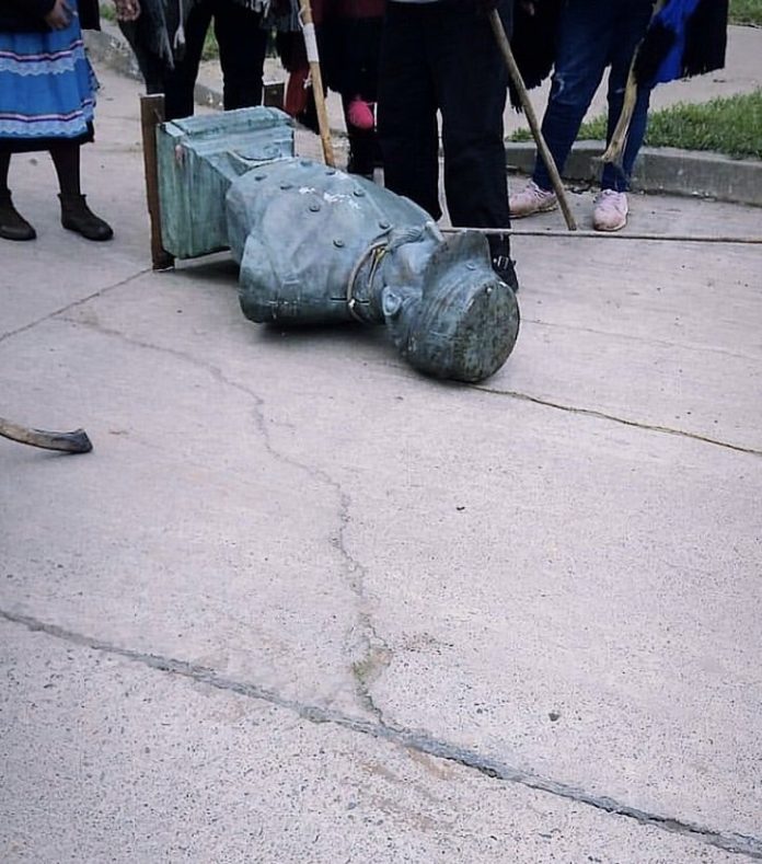 Este viernes 07 de agosto comunidades mapuche derribaron y lanzaron al río la estatua de Cornelio Saavedra, otro de los mayores genocidas durante la ocupación de los territorios Mapuche por parte del Ejercito, oligarquía, comerciantes y clase política de la naciente República de Chile a mediados del siglo 19.