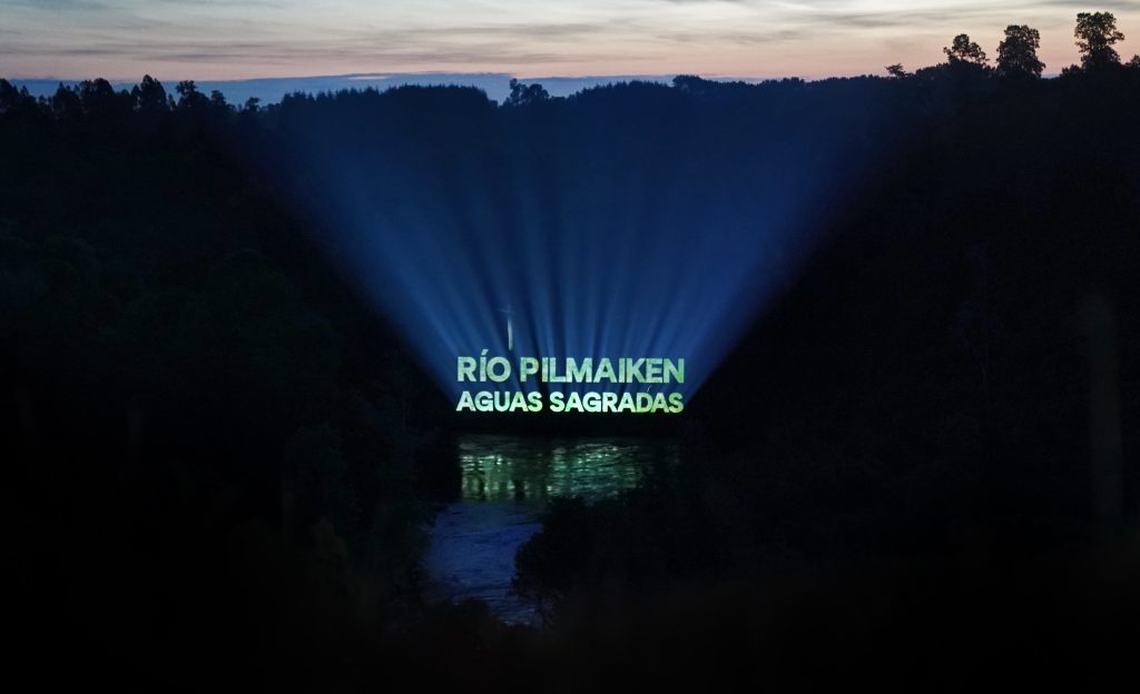 La segunda semana de julio de este año 2020, la Corporación Cultural-Ambiental Traitraico (@corpo_traitraico) y el estudio de arte DeLight Lab (@delight_lab_oficial) publicaron una serie de fotografías en apoyo a la defensa del Pilmaiken. Las imágenes muestran proyecciones de luz en vivos colores sobre las laderas del río en un anochecer azuloso y naranja. Vemos, por ejemplo, a la Machi Millaray Huichalaf con su kultrun (instrumento ceremonial Mapuche), vemos un pangi (puma), un t’eümül’ (monito de monte), una pilmaiken (golondrina), un chucaw (chucao) y, también, mensajes como “Territorio Sagrado” y “Pilmaiken Resiste”.