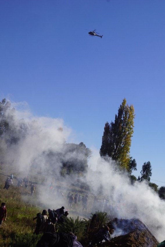 Carabineros con su dron ubica el lugar donde se hacia el txawun y comenzó a bombardear nuevamente con lacrimógenas en el nuevo lugar, donde llega a una mesa en la que almorzaban los niños de nuestros peñi y lamgen.