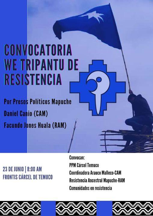 Invitar a nuestras Lof y al conjunto de nuestro Pueblo a acompañarnos en el Wiñoy Tripantü de Resistencia Mapuche que en conjunto con los demás peñi PPM convocamos desde la cárcel para el miércoles 23 de Junio desde las 08:00 hrs. El que se realizará a su vez, en el frontis de la cárcel.