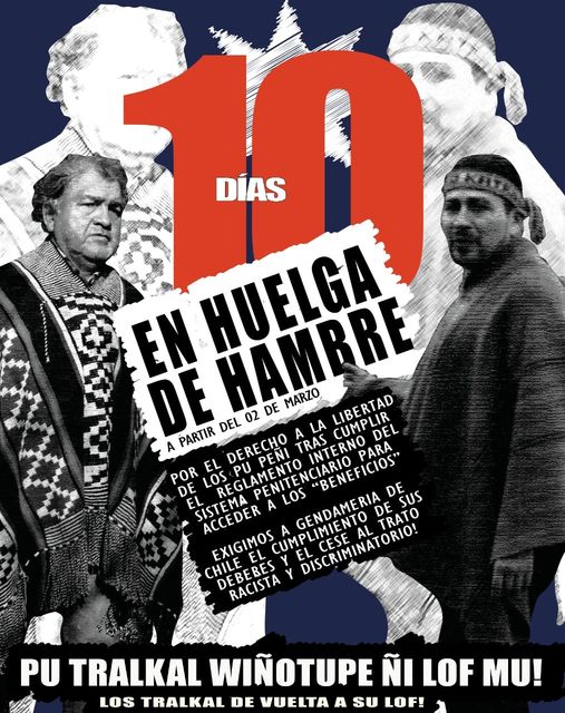 Hoy viernes 11 de marzo, cuando todas las miradas se han volcado al cambio de mando, los primos Tralcal presos políticos mapuche, cumplen 10 días en HUELGA DE HAMBRE, tras la prolongada negativa de Gendarmería en responder la solicitud, conceder y hacer efectivos los beneficios penitenciarios que al cumplir ciertos requisitos les corresponden por derecho: SALIDA DOMINICAL, ESPORÁDICA, TRIMESTRAL Y LIBERTAD CONDICIONAL.
