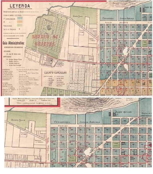 Imagen: Barrio Coilaco 1919. Con cruces en rojo se muestra el límite urbano en Avenida Prieto Norte. Se destaca estero Coilaco o canal Gibbs cruzando por calle Las Heras. Captura realizada utilizando el mapa Plano de la ciudad de Temuco y sus poblaciones, material cartográfico. Temuco. Recuperado 15 de diciembre de 2020 desde: http://www.bibliotecanacionaldigital.gob.cl/