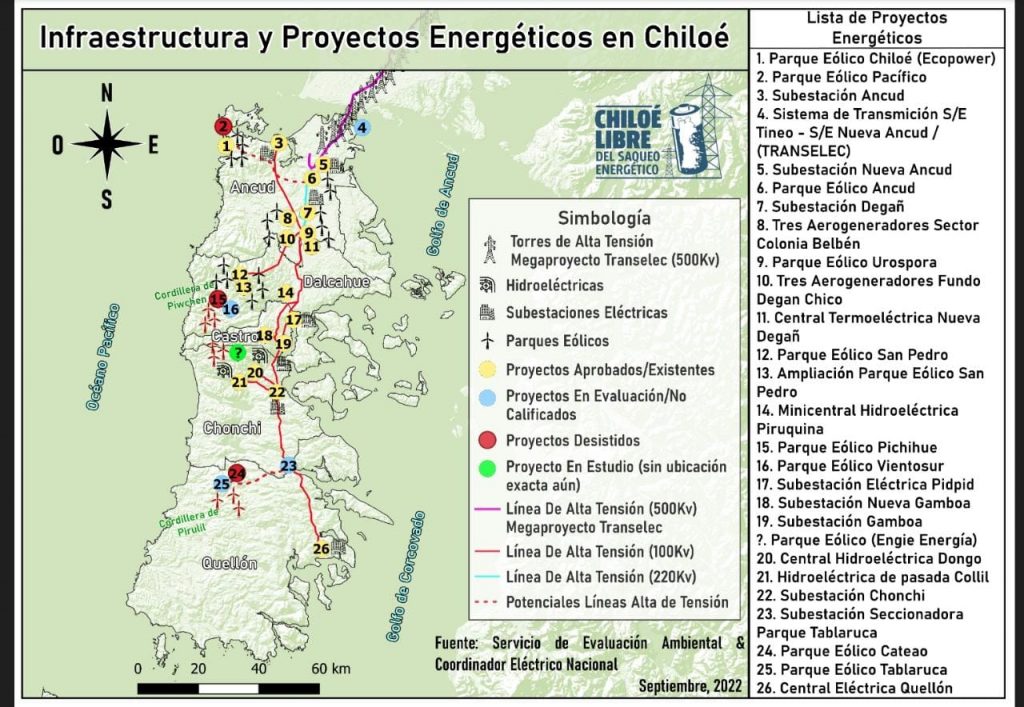 En los últimos años, comunidades mapuche williche y otras organizaciones territoriales se unieron en una campaña comunicacional comunitaria llamada Chiloé libre de saqueo energético, donde participan personas del mundo académico, científico, del derecho y otras disciplinas, para informarse y difundir el rol que está cumpliendo Chiloé en la estrategia energética del país, y los impactos que eso puede tener en los territorios. “Un primer hito fue cuando nos enteramos de que se estaba licitando una gran carretera eléctrica y nos pusimos a disposición delas comunidades del tramo inaugural de este proyecto al cruzar el canal de Chacao, para ayudar a elaborar las observaciones ciudadanas en el Servicio de Evaluación Ambiental (SEA)”, recuerda Antonia, una de las integrantes y voceras de la campaña.