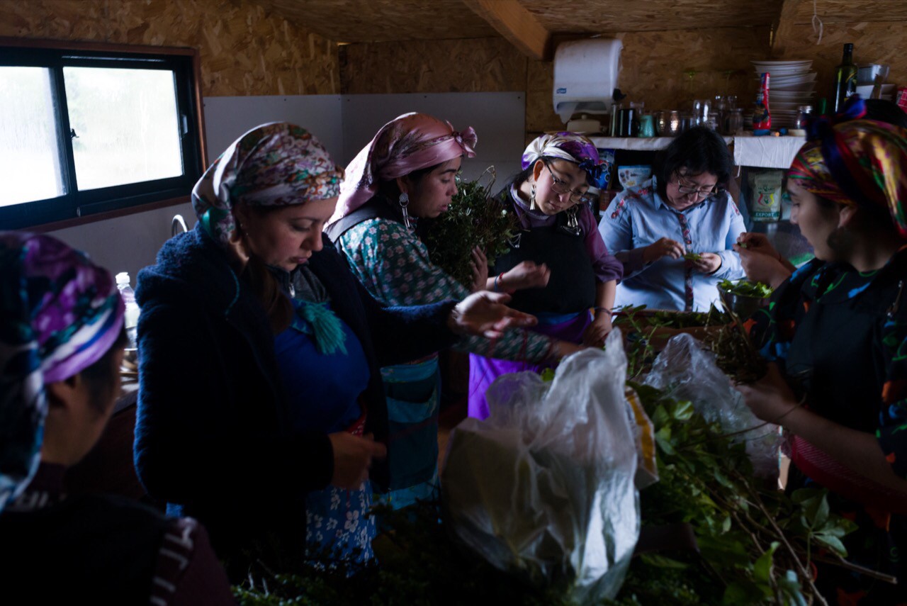 La machi Millaray Huichalaf, que hace 14 años encabeza la defensa del río Pilmaiquén, acompañada de otras mujeres mapuche que también están recuperando la medicina ancestral mapuche. Foto: Pablo Piovano.