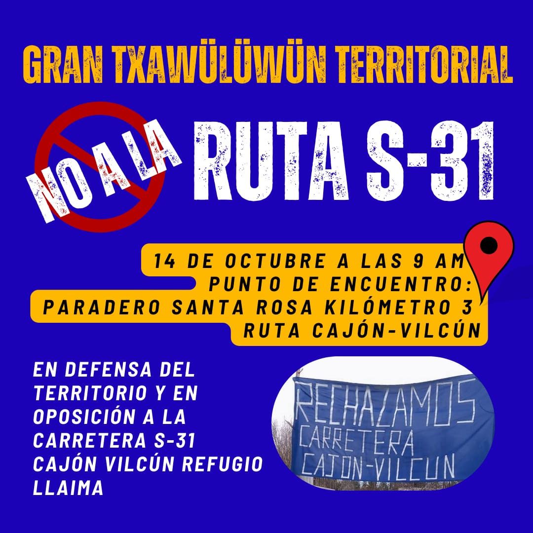 Las Comunidades Juan Llanquitur del Lof Ñinquilko, Vilcún, y diversas comunidades de Nünkülko, Pirkunche, Llamuco y Notxüko, convocan «a todas las comunidades, autoridades tradicionales, peñi y lamngen del territorio a un gran txawülüwün, para conversar sobre el proyecto que pretende intervenir la ruta S-31 Cajón Vilcún Refugio Llaima»