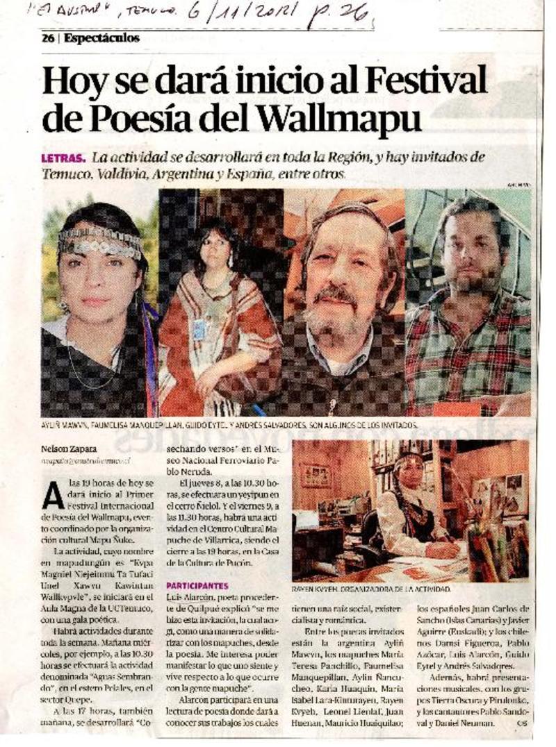 La región de La Araucanía será escenario del “IX Festival Internacional de Poesía del Wallmapu”, organizado por el Colectivo Mapu Ñuke Kimce Wejiñ, agrupación de poetas y artistas mapuche que promueve las obras musicales y poéticas en lenguas originarias e impulsa la producción literaria a nivel regional.
