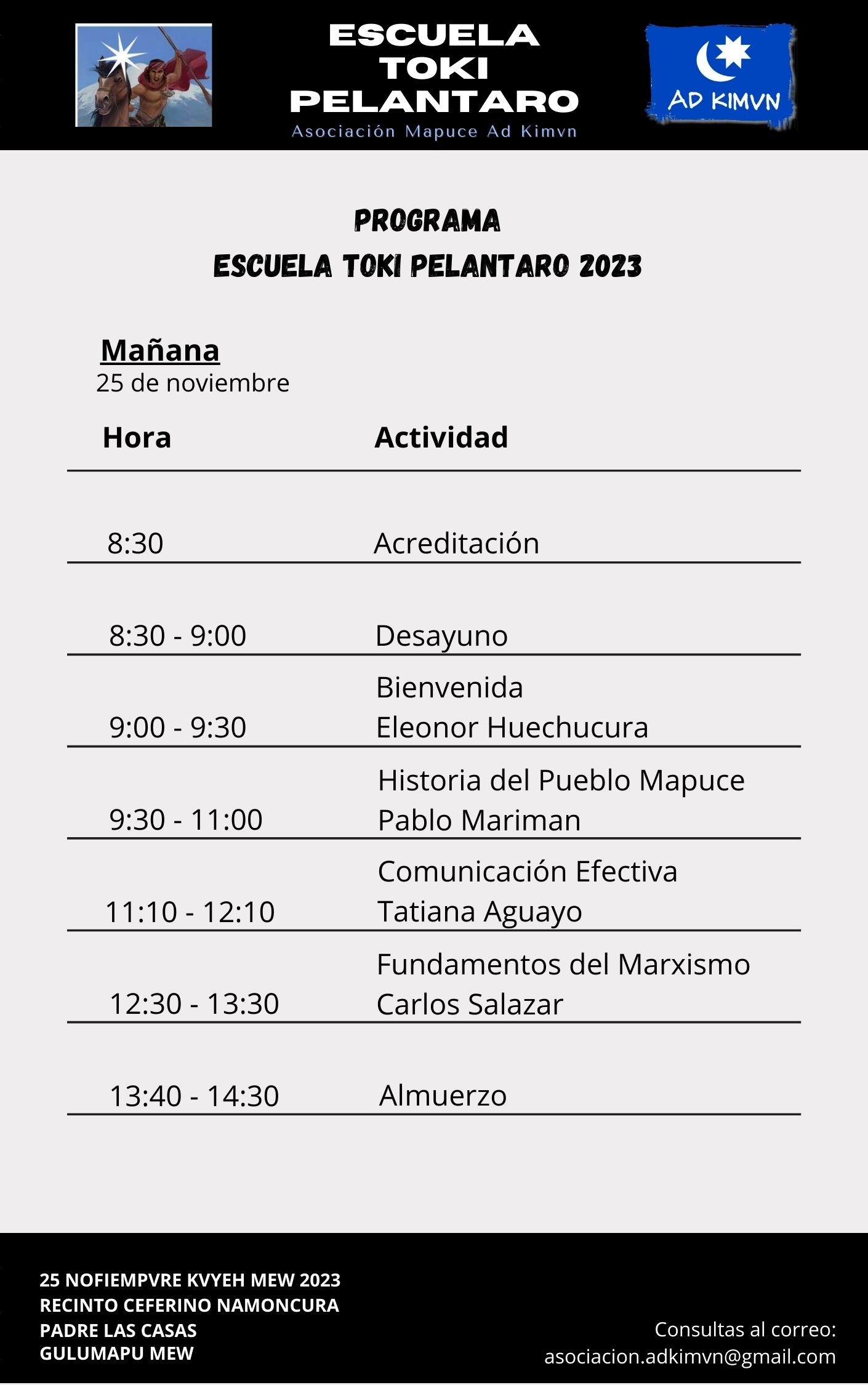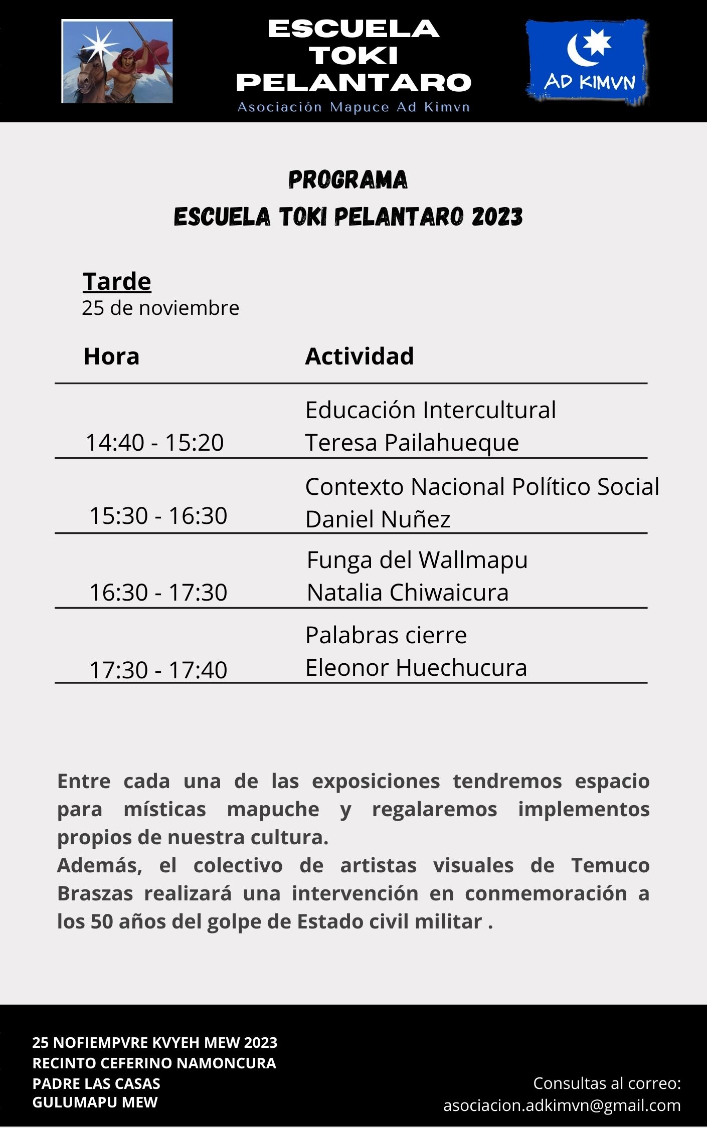 Para este sábado 25 de noviembre a partir de las 8:30 am se espera la 15ª versión de la Escuela Toki Pelantaro, que como es tradición contará con diversas temáticas atingentes al contexto sociopolítico de Wallmapu.