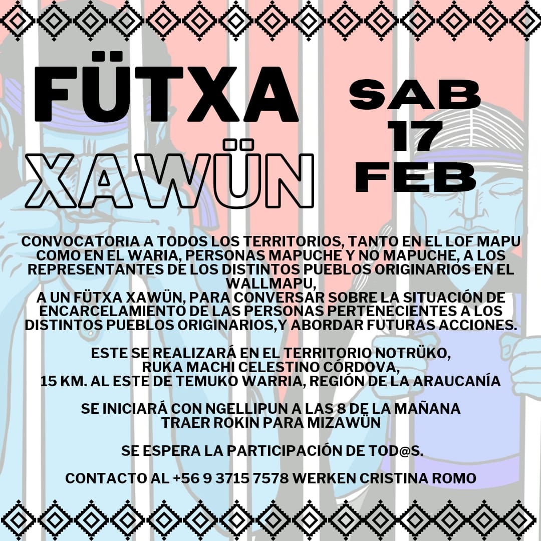 Por último, dejamos la invitación a un Futxa Txawülüwün que tendremos este sábado 17 de febrero desde las 8 de la mañana para conversar sobre las condiciones carcelarias de todos los privados de libertad perteneciente a los pueblos ancestrales, en la casa del Machi Celestino Córdova en la Comuna de Padre las Casas de la novena región de la Araucanía.