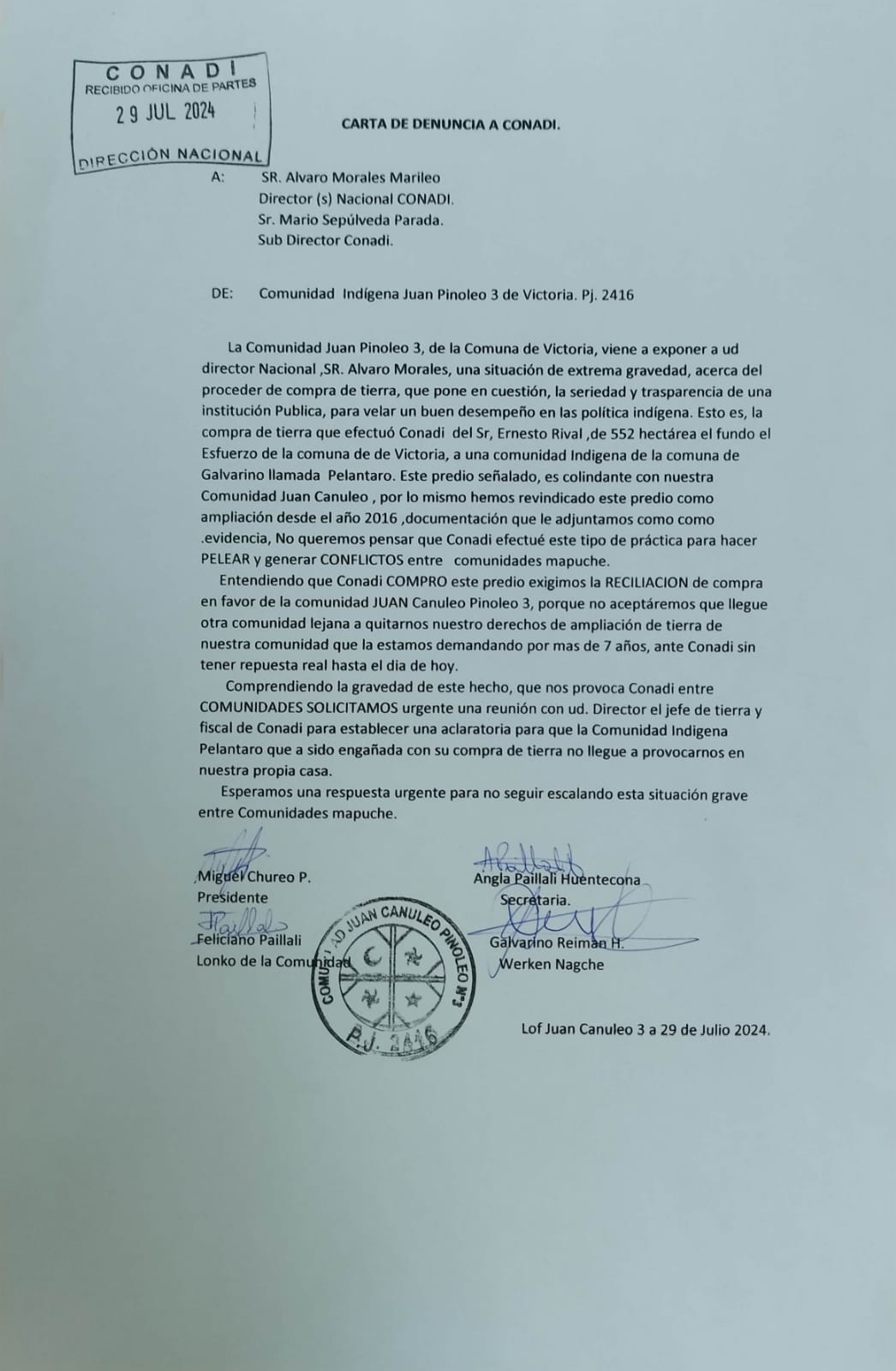 Las situaciones anteriores es la que quieren evitar desde la comunidad Juan Pinoleo 3 de Victoria quienes a través de un comunicado público emplazan a CONADI a atender el conflicto que podrían generar al entregar un predio de 552 has que el organismos estatal chileno quiere adjudicar a una de la comuna de Galvarino.